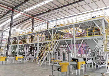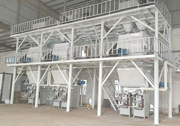 砂漿生產線主要由原料儲存系統、配料稱重系統、輸送系統、混合系統、氣相平衡系統、包裝系統及除塵系統構成。主控制系統依據選定工藝配方下達生產指令,系統自動從儲料倉中按配比提取原料,原料經配重后依次進入待混倉及無重力高效混合機,實現快速混合作業。