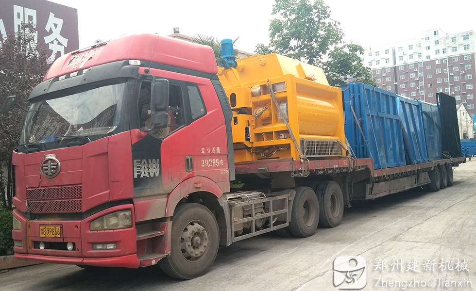 9月14日,一套建新HZS75攪拌站設備在廠家裝車完畢,等待運往甘肅省。圖為運輸車輛在建新機械廠區門口等待出發。