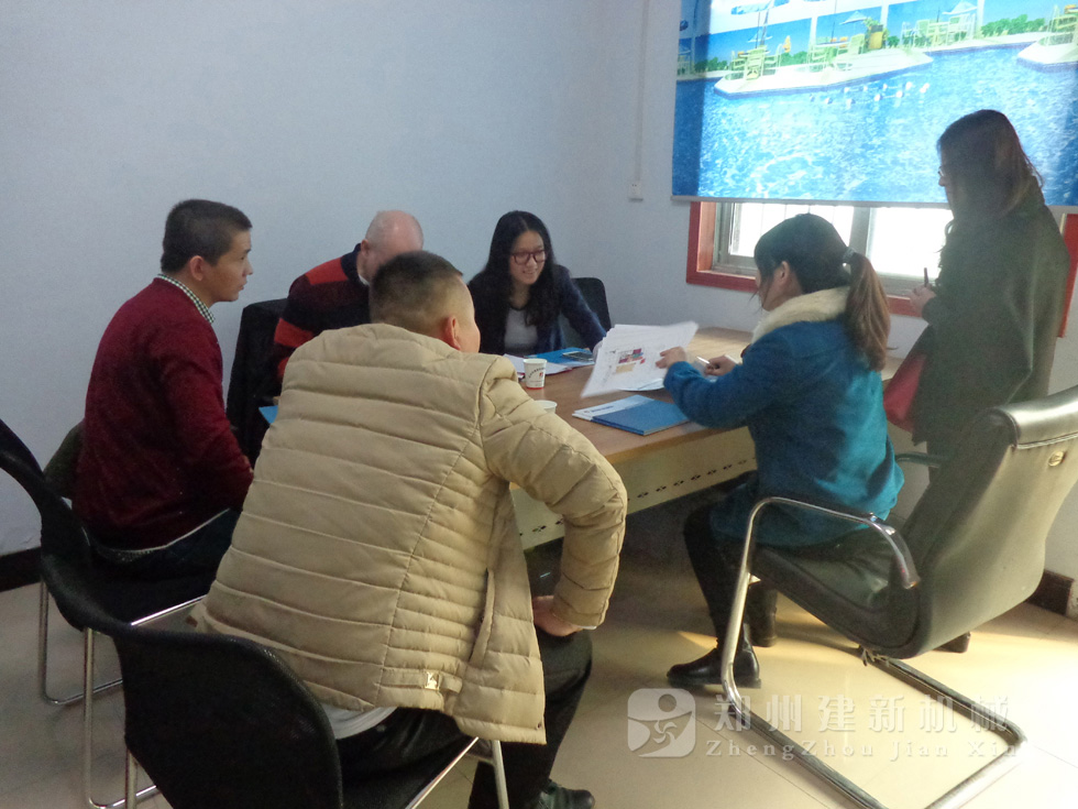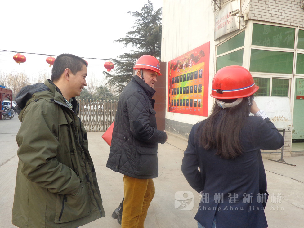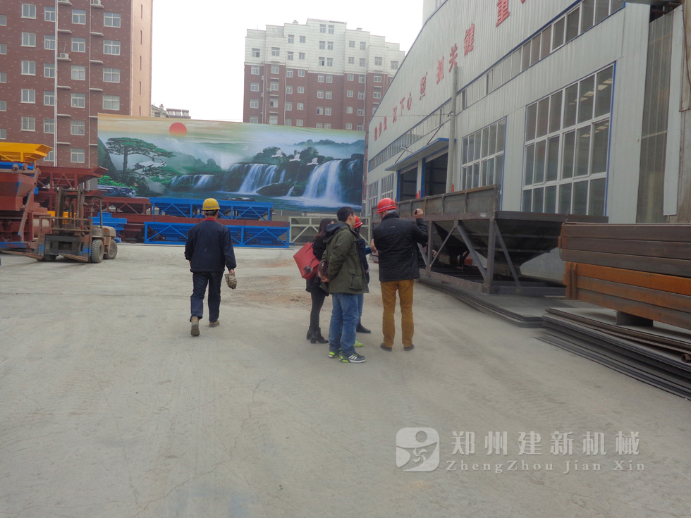 2014年11月,來自俄羅斯的客戶來到鄭州建新公司簽訂了兩套時產120方混凝土攪拌站設備的大訂單,下圖為建新公司銷售部劉經理、經理帶客戶參觀建新公司的生產車間及成品貨場。